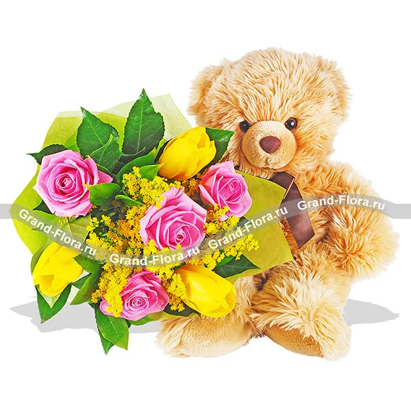 Уменьшенный: роза розовая - 4 шт., тюлпаны желтые - 3 шт., солидаго - 3 шт., декоративная зелень, фетр желтый + мягкая игрушка "Медведь" - 15-20 см.